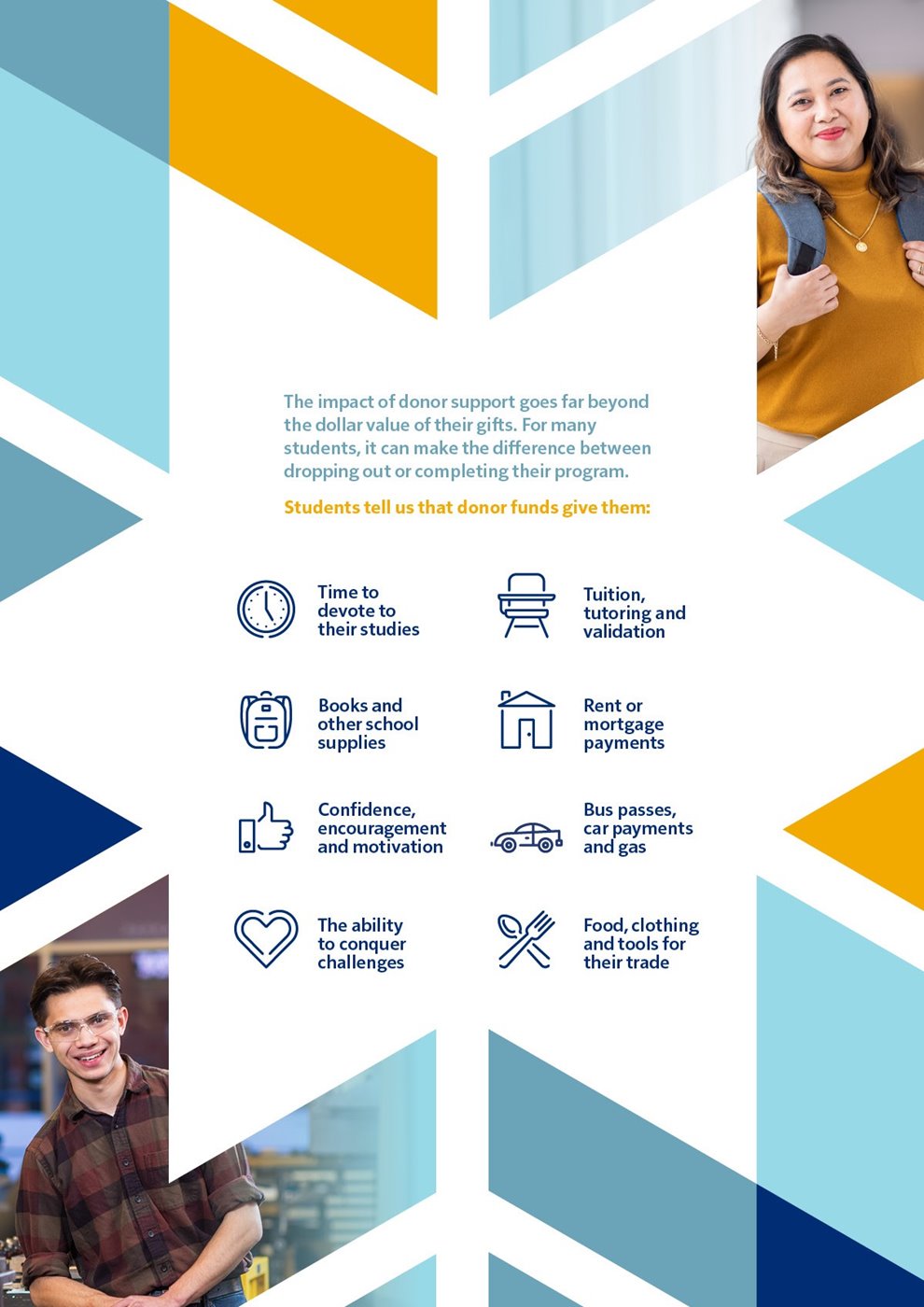 With no administrative or processing fees, 100% of your donation goes to supporting students. You can feel confident that your gift will make a real, lasting impact on students when they need it most.