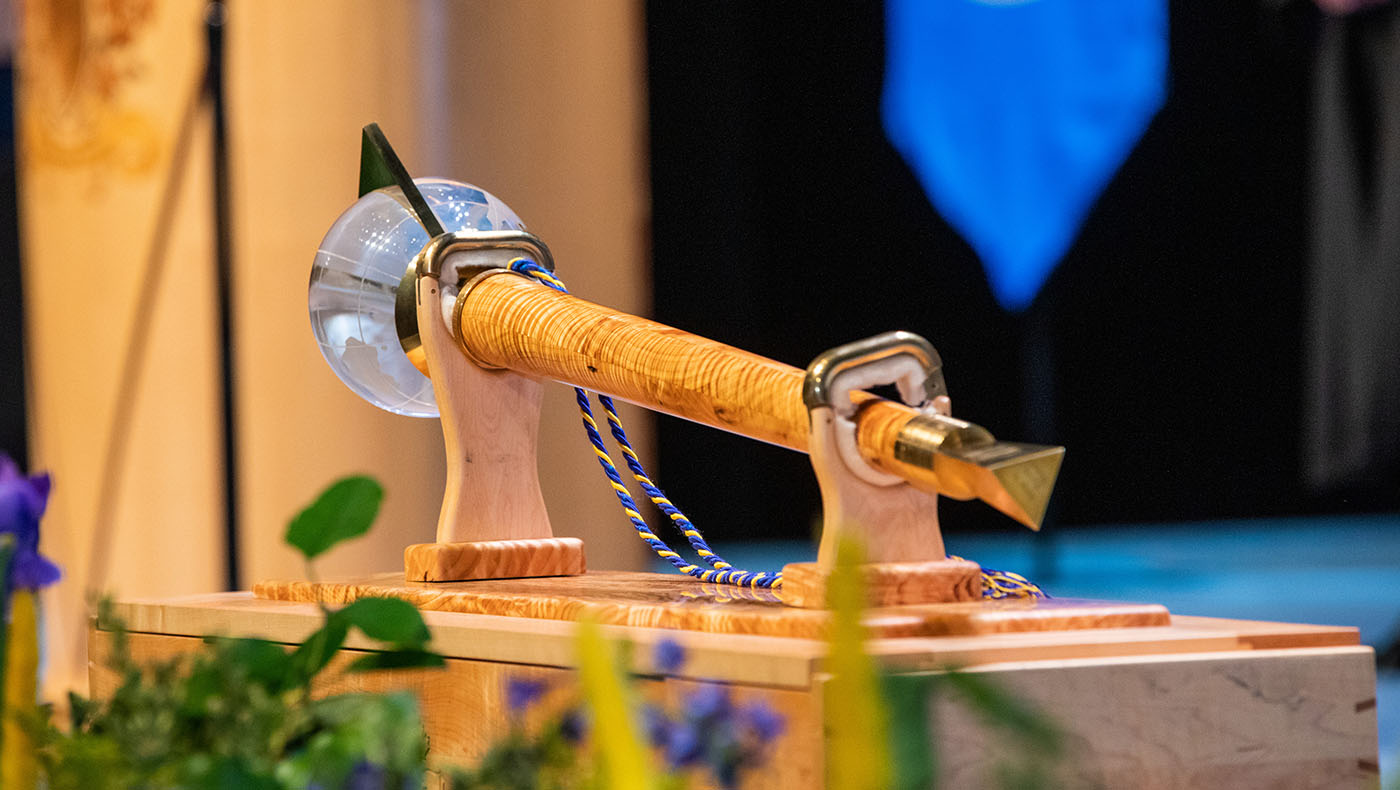 The ceremonial mace was built by NAIT staff members and adopted in 2007 to represent the institute’s authority to grant certificates, diplomas and degrees.